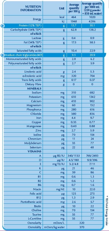 Maltodextrin, Hydrolyzed Whey Protein (Cow’s milk), Sucrose, Medium Chain Triglycerides, Potato Starch, Vegetable Oils (Low Erucic Acid Rapeseed, Sunflower Seed), Minerals (Calcium Carbonate, Magnesium Chloride, Sodium Chloride, Calcium Chloride, Ferrous Sulphate, Zinc Sulphate, Manganese Sulphate, Copper Sulphate, Potassium Iodide, Chromium Chloride, Sodium Selenate, Sodium Molybdate), Emulsifier (Soy Lecithin E322), Acidity Regulator (Citric Acid E330), Vanilla Flavour, Choline Bitartrate, Vitamins (C, E, Nicotinamide, Calcium Pantothenate, B6, B1, B2, A, Folic Acid, K1, Biotin, D3, B12), Taurine, L-carnitine.